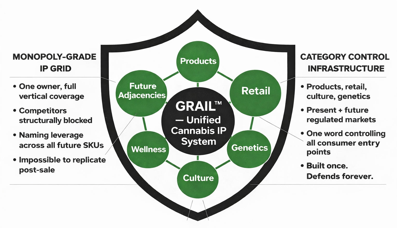Grail is a consolidated IP grid designed to defensively control all core cannabis and emerging categories with one brand purchase.
